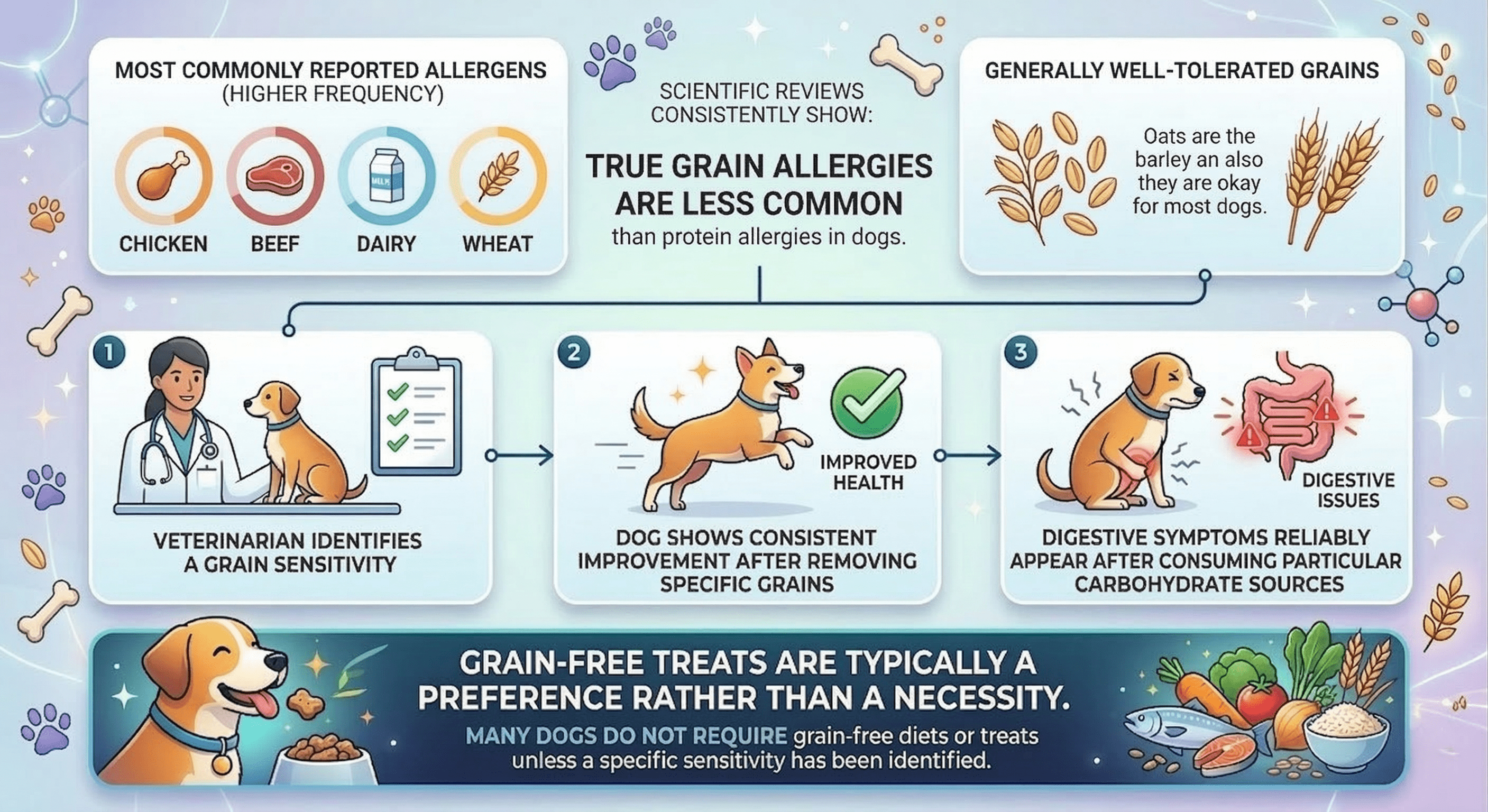 Scientific reviews consistently show that true grain allergies are less common than protein allergies in dogs. Chicken, beef, dairy, and wheat are among the most frequently reported allergens, while grains such as oats or barley are generally tolerated by many dogs. As a result, many dogs do not need grain-free diets or treats unless a specific sensitivity has been identified.